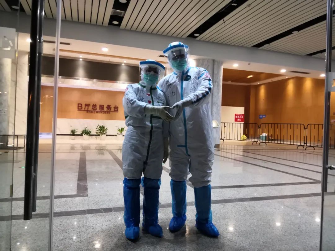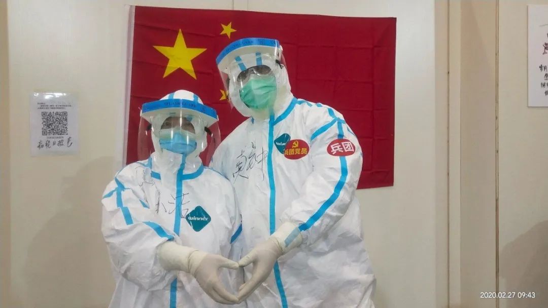 生命重于泰山,疫情就是命令,武汉作为全国疫情防控的关键点,抗击疫情的工作是紧张而忙碌的,他们工作的武汉东西湖方舱医院是当时武汉最大的一所方舱医院,共收治患者1760余人,运行早期有大量的工作需要完成,孙洁作为随队唯一一名院感工作人员,既要负责方舱医院院感防控工作,又要负责队伍驻地和队员感染防控管理,每天的生活被大量的巡查、指导、监督和制度修订工作填满,黄钟同志既要负责队伍内部管理流程、物资保障工作,同时也要对方舱医院外围搭建帐篷单元进行维护管理,还要完成方舱医院医务部总值班工作,他们在各自的岗位上为武汉东西湖方舱医院的顺利运转和兵团援鄂医疗队的安全做出了重要的贡献。两人工作虽然时有交集,却忙的没有时间坐在一起说个话,只能通过一个微笑,一个眼神,一句简单的嘱咐“做好防护”表达心中的挂念。在武汉工作和生活中,黄钟和孙洁互帮互助,为队伍管理和感染防控、队员培训尽心尽责,共同完成队伍感染控制管理和全员院感技能防护培训和考核工作。有时间就在一起交流学习防控和救治患者的知识,不断提升自身业务和管理水平,工作中,他们也彼此照顾,每次进舱工作之前,都会仔细检查对方防护服穿戴,防止暴露,帮助写上名字方便工作。他们用实际行动关心着对方,用努力工作为兵团援鄂医疗队安全保驾护航,方舱的工作和驻地维护填满了他们的日程。随着方舱医院管理工作走上正轨,黄钟和孙洁夫妇又积极参加一线医生值班工作,希望为抗疫一线做出更多贡献,完成了武汉东西湖方舱医院“患者零死亡,医护零感染”的艰巨任务。3月27日孙洁医生参与编写的《方舱医院感染控制手册》中英双语电子版书,面向全国及海外免费发行,为国外管理人员和医务人员详细了解方舱医院这一新兴事物,提供了宝贵的中国经验。