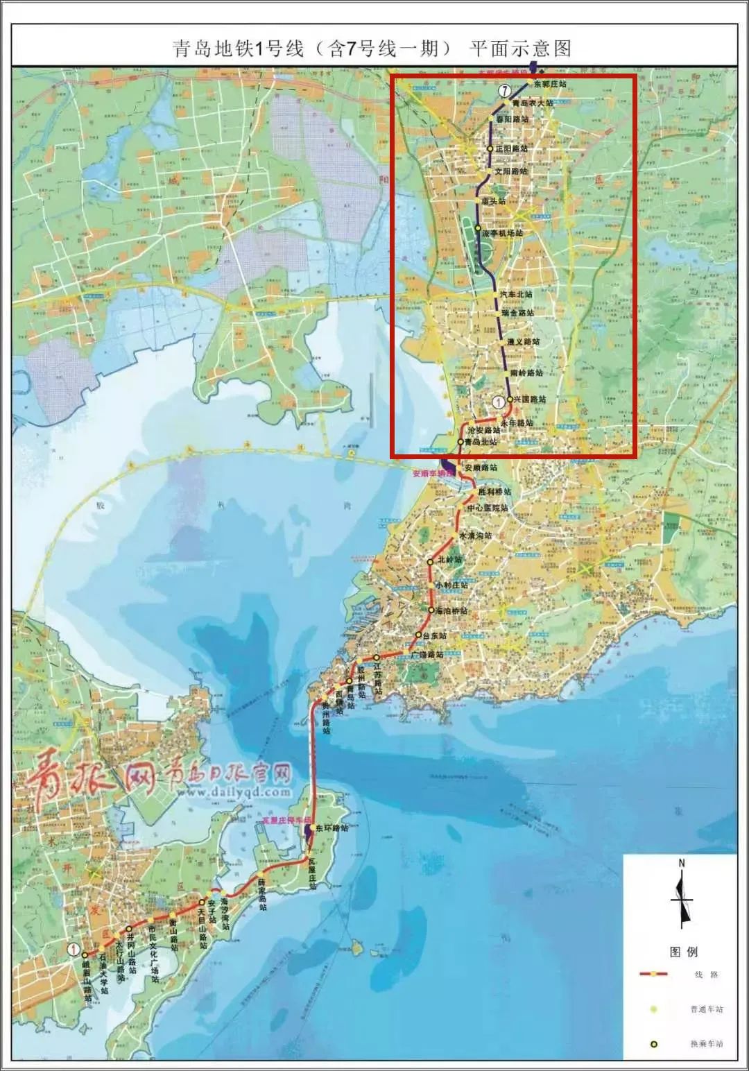 地铁1号线北段今年通车。所涉车站为东郭庄站-青岛农大站-春阳路站-正阳路站-文阳路站-庙头站-流亭机场站-汽车北站-瑞金路站-遵义路站-南岭路站-兴国路站-永年路站-沧安路站-青岛北站。
