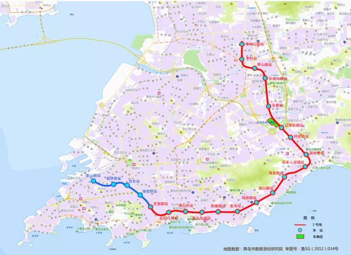 2号线东段(李村公园站——芝泉路站)、西段(芝泉路站——泰山路站)已经通车。西延段(泰山路站至轮渡站)于2019年开工建设,支持青岛国际邮轮港发展,并预留向西过海条件,助力青岛西部城区崛起。目前国际邮轮港、小港站、轮渡站、轮渡站站后折返线工程有序推进,TBM始发井顺利完成开工条件验收。
