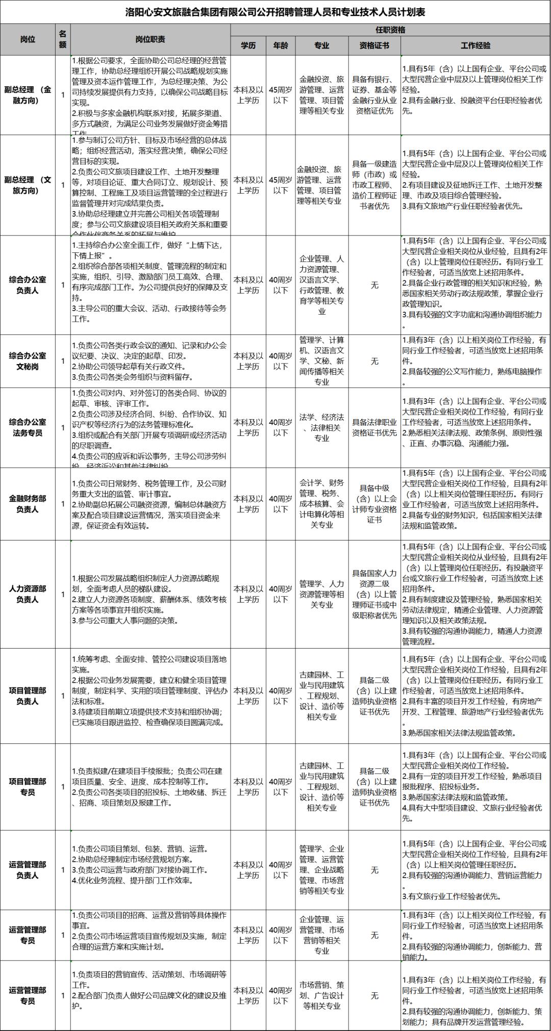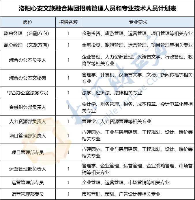 5月15日,洛阳心安文旅融合集团有限公司(以下简称洛阳心安文旅融合集团)发布招聘公告,面向社会公开招聘管理人员和专业技术人员12人。