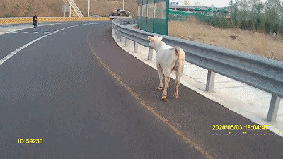 当时正是五一小长假出行的高峰时段,这么一个“牛魔王”上了高速路,那还了得!!于是交警叔叔们立即出动!抓捕行动开始!先想办法把它赶到应急车道上,