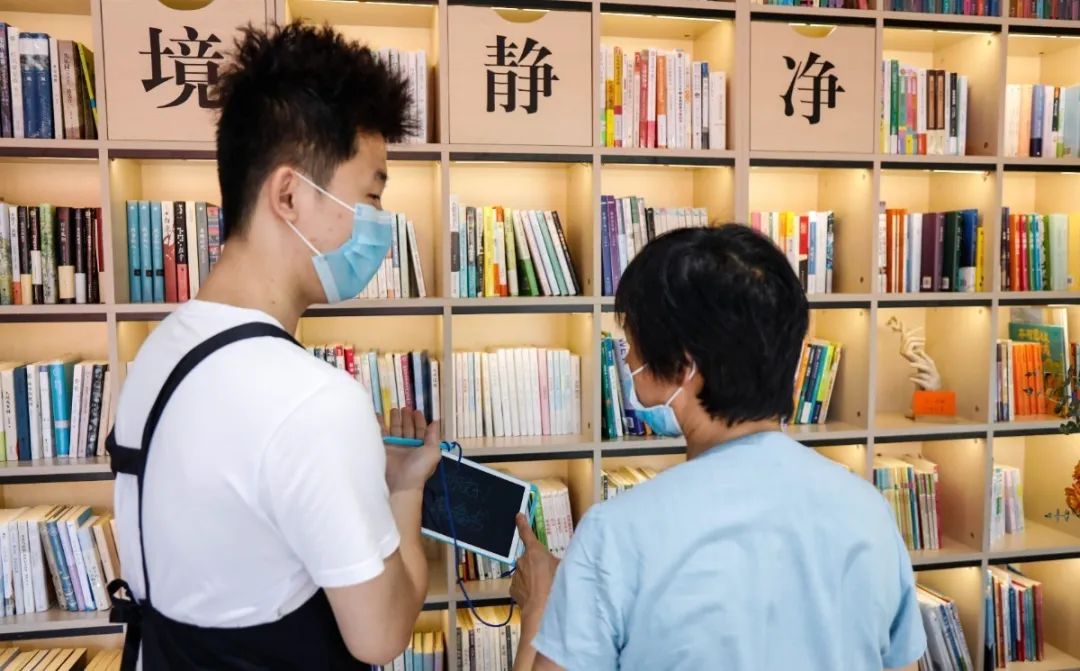 店员拿着题写板与顾客交流