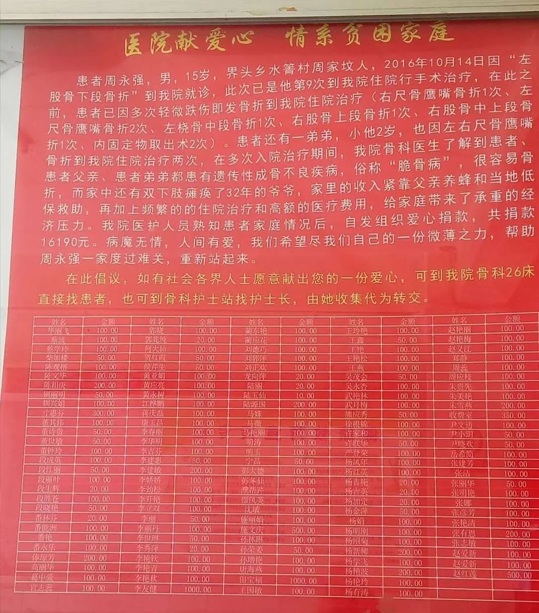 2016年10月,大儿子第11次到医院治疗,此前已经多次骨折,耗尽了所有积蓄,幸得社会各界爱心人士纷纷捐款,帮他渡过了难关,入住的腾冲市东方医院医护人员爱心捐款就有16190元。事后周绍山将捐款名单做成巨幅海报张贴在医院门口,他说:“别人可以不看,但我必须这样做。”他叮嘱儿子,“你的命是这些人给的,将来有机会你要想着报答他们。”两个儿子也很争气,深知家庭艰难,学习格外刻苦。如今一个读高中二年级,一个读职高二年级。
