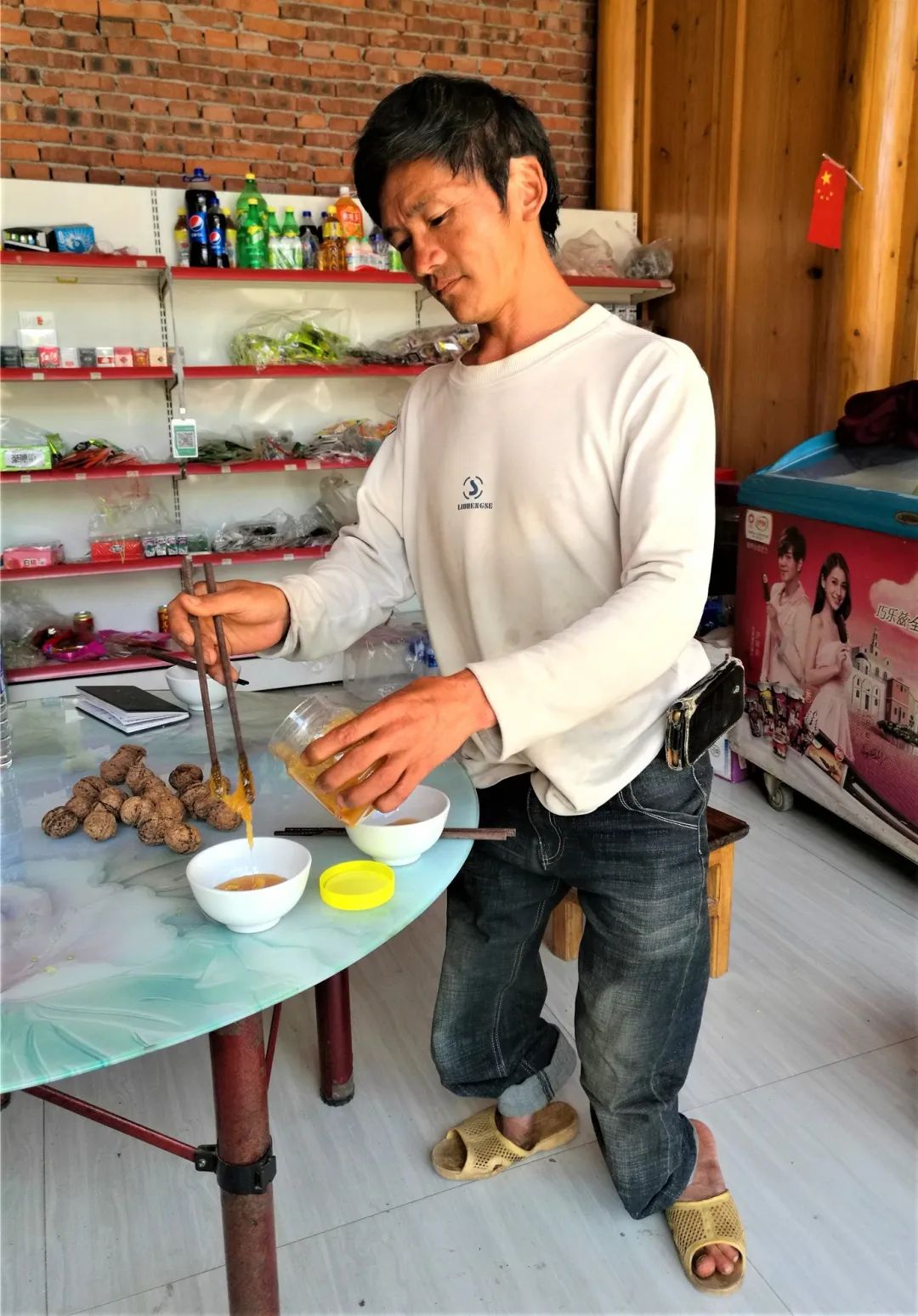 家里中堂前设立了杂货架,陈列着烟酒糖食等日用百货,那是周绍山在家里开办的杂货店。他说:“杂货店也是村干部帮着搞起来的,既方便了大家又增加了我家收入,村民有时来买东西,我家没人时,他们会自己取走留下货款,不会多拿也不会少给。有时他们还专门挑着来我家买,我明白这是有意在帮助我,我也会公道公平地做生意,相互都很诚信。”采访间,时不时有村民进家来买东西。有个叫胡有庆的村民来买周绍山养殖的生态蜂蜜。品质一流的野生蜂蜜,如今市面上早已卖到了120元一斤,他却依然只卖100元一斤给胡有庆。“你3斤蜂蜜不就少赚了60元吗?不觉得亏吗?”记者问他,“都是熟人寨邻的顾客,大家平时也对我家有许多关照,我也念着大家的好,想着要回报乡亲,不亏啊!”周绍山朴实的话语里流露出真挚与感恩。