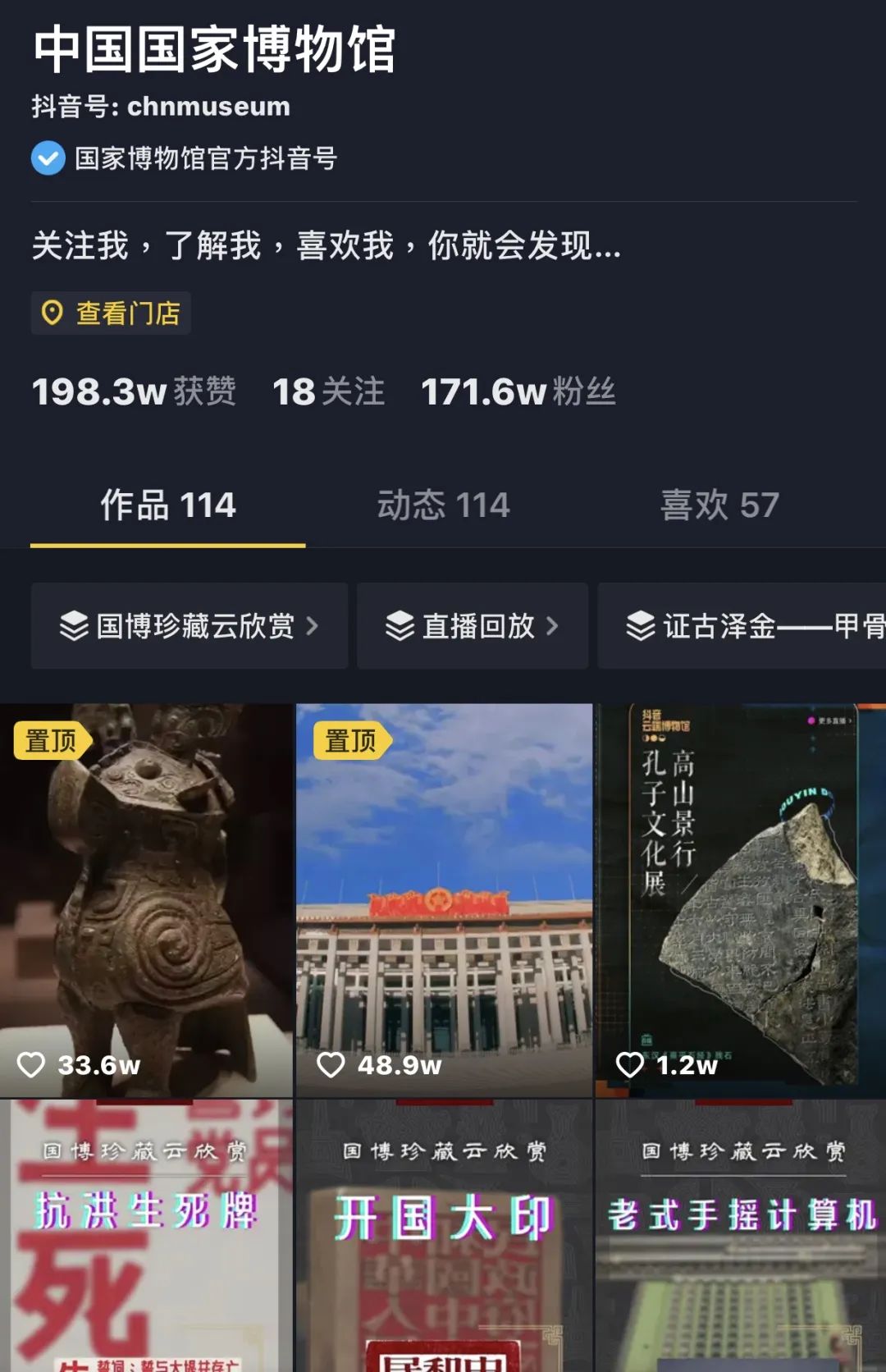 疫情期间,国家博物馆还策划了直播内容。在#看干货学知识、#在家云游博物馆等标签之下,国家博物馆进行了三场直播,均为对甲骨文展的回放。在抖音平台拥有超170万粉丝,国家博物馆将已发布的114个作品分类成不同的合集。例如,“国博珍藏云欣赏”作品合集内共有13期内容,由每集不超过两分钟的短视频组成。