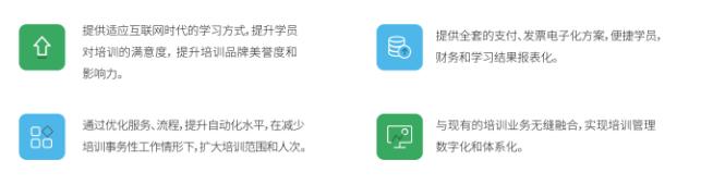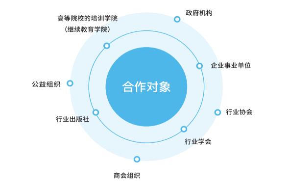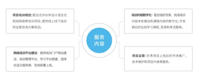 围绕“互联网+培训”的立项、内容体系、平台建设、商业模式、运营机制等核心要素进行重构,充分融合继教云与合作伙伴的优势,帮助合作伙伴占据“互联网+培训”的高地,实现倍增经济效益、社会效益。