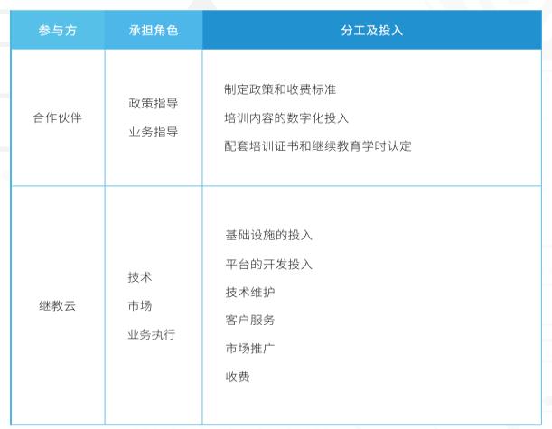 继教云投入技术平台、内容、运维服务,双方共建,共同面向市场,收益共享的机制。