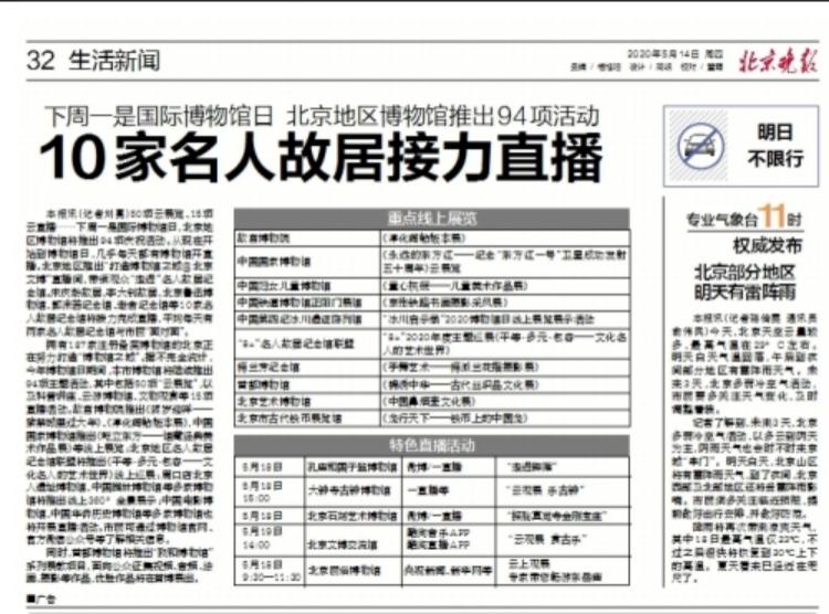 北京晚报以《10家名人故居接力直播》为标题,在报纸、网站和客户端刊载系列直播消息;首都建设报以《名人故居开直播》为标题,在报纸网站报道相关内容。