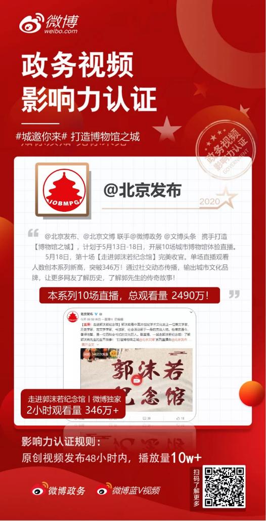直播活动同时还参与“国际博物馆日”、“博物馆奇妙之旅”、“城邀你来”等多个微博话题。直播活动相关微博多次获得“政务视频影响力认证”(认证规则:原创视频发布48小时内播放量超过10万人次),并被@微博政务 评为“诚邀之星”。