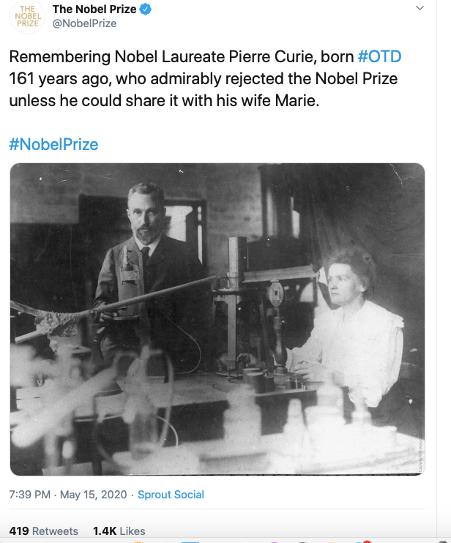 诺贝尔官推:请记住诺贝尔获得者皮埃尔·居里,他生于161年前,他十分令人尊敬地拒绝了诺贝尔奖,除非他可以和他的妻子玛丽一起分享这个奖项。