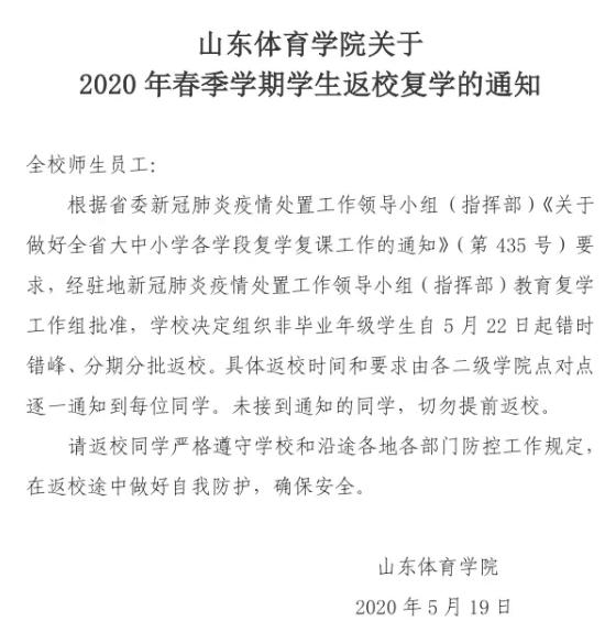 根据山东省关于高校学生返校复学工作的统一部署,结合学校疫情防控工作实际,经研究,定于5月25日起按照精准、可靠原则组织学生分批、错时、错峰返校。