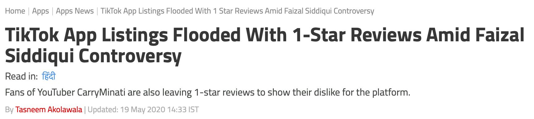 此前,印度人民党Tajinder Pal Singh Bagga发布了一条推特,他指出:在TikTok拥有超1340万粉丝的用户Faizal Siddiqui上传了一条向一名女孩脸上泼酸性液体的视频,并在视频中威胁女孩离开自己去找另一个男人。在接下来的场景中,女孩的脸涂着厚厚的红色化妆品,表明自己被烧伤,当地各大媒体也在报道中对此事进行谴责,也引起印度用户对TikTok的抵制。