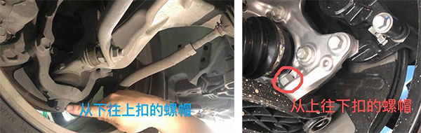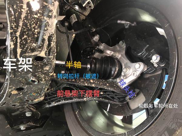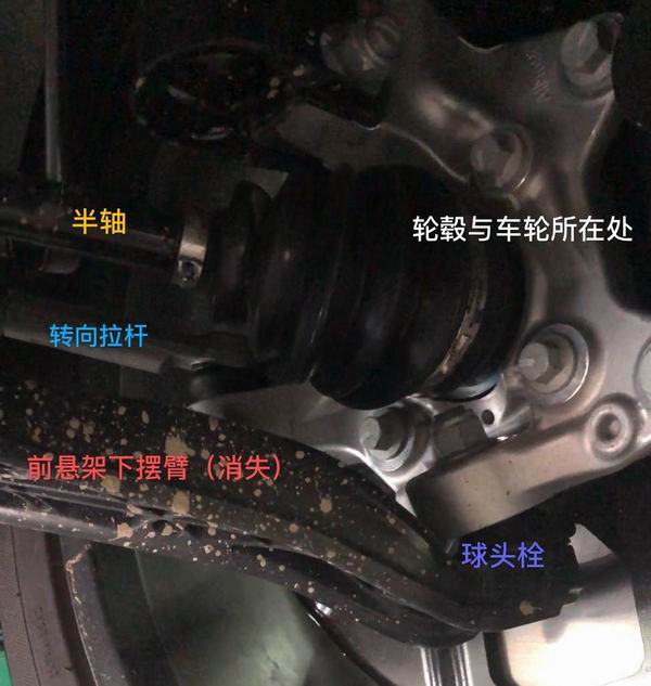 而此时,车上那块疑似引发“断轴”该车前悬挂系统的右前下摆臂和与之连接的转向球头插销、螺栓等已不翼而飞,仅剩一个孤零零的螺帽躺在副车架上。