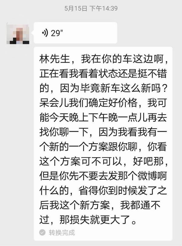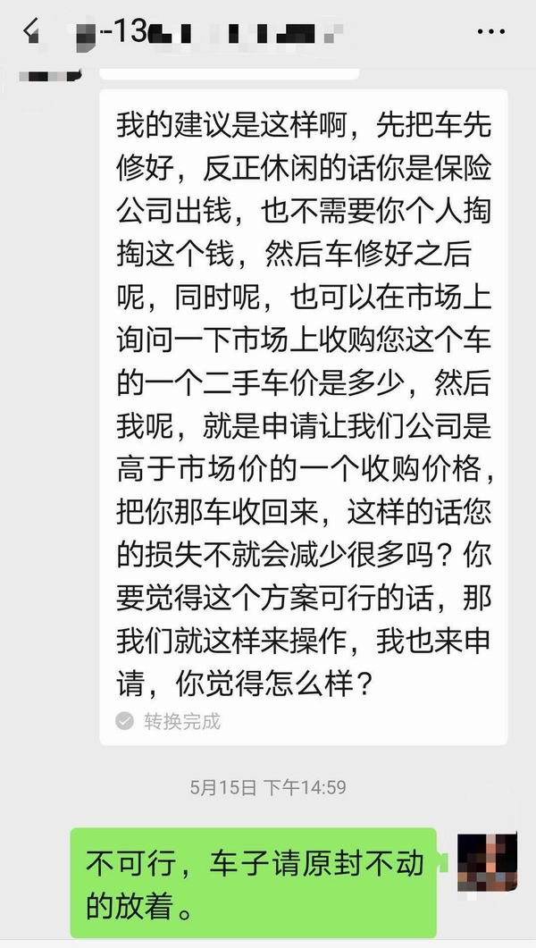 当天下午4点左右,李普与袁先生通过微信沟通。李普对袁先生表示,“我现在车旁边,您的车无大问题,可以修好。”同时李普表示并请袁先生不要在社交媒体发布相关内容,“不然二手车回购的方案(即前述第二个方案)会很难通过”。袁先生再次拒绝,并通过微信文字形式第三次告知“车子请原封不动地放着”。