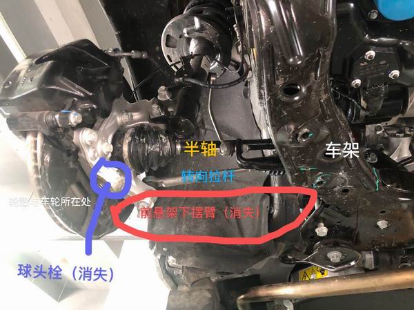 “我也不认为新材料有问题,事实上从事故照片也看出来这根下摆臂是完好的,”郭先生还是将关注点放在了与之相连的球头螺栓,他认为,“正常车辆,是下摆臂通过球头中的螺栓固定到车轮的转向节上,从事故照片也可以看出,整个下摆臂连同球头和螺栓一起脱开了,轮胎和轮毂因此失去了横向的支撑力,从而活生生把转向轴拉脱出车架。”