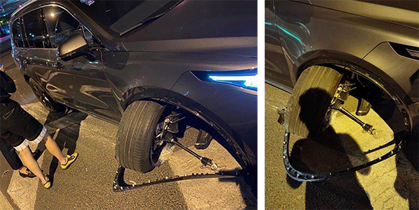 这一引发争议的“断轴”事故发生在5月11日晚,袁先生的妻子刘女士驱车回家之时。据她回忆,当晚她于延安中路自西向东行驶,“接近路口时,我感觉右前轮轻轻蹭到了路肩也就是马路牙子,然后紧接着‘轰’的一声巨响。”