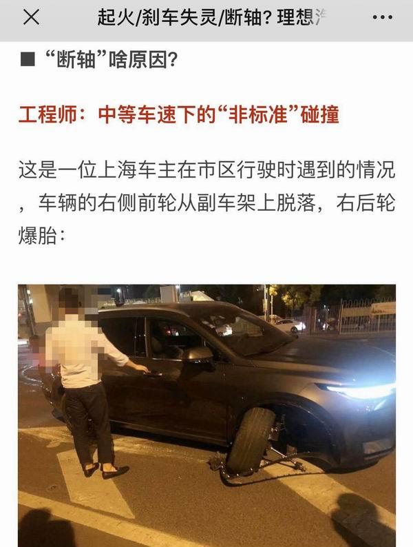 5月15日,一篇标题为《起火/刹车失灵/断轴? 理想汽车独家回应事件真相》的文章出现在网络,有业内人士认为,这篇“独家”文章可以看作理想汽车对“断轴”事件的侧面“回应”,毕竟“公关口径没有那么快就能出正式答复,那么通过媒体从工程设计口径来做解读,也是常见的一种解释手法。”