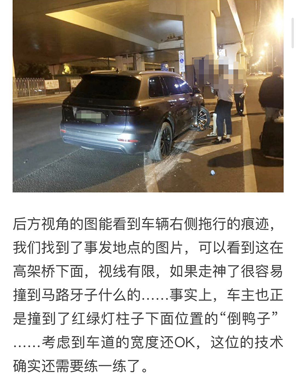 该文章将袁先生的“断轴”改称为“脱轴”,并认为事故原因是“中等车速下的‘非标准’碰撞”。文章称,“理想ONE在研发阶段会进行多次的悬架坏路测试,比如以最高60公里/小时冲向斜向45度布置的马路牙子,但是对于案例中这种50公里/小时左右速度侧向挤压的情形,属于‘非标准测试’,确实是设计中不能面面俱到的。至于大家最关心(或者说最担心)的钢塑复合材料下摆臂,在这次碰撞中其实完好无损,说明之前的零部件和整车设计测试还是靠谱的。”文章作者还建议车主“技术确实还需要练一练”。