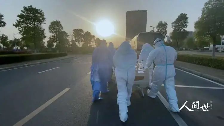 转院时,穿蓝色防护服的上海医生和穿白色防护服的武汉医生推着爷爷向阳光走去。