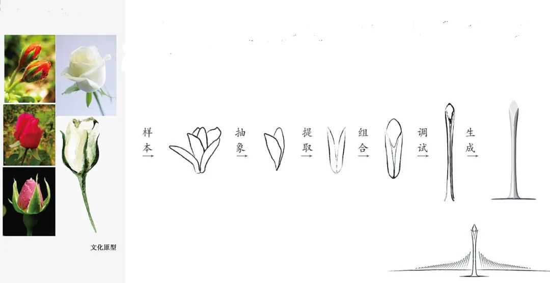 以南阳市市花——月季花为造型的主塔,与以往人们提取盛开鲜艳的月季不同,本次提取月季花含苞待放之时的叶片纹理进行抽象与重构,重新组合演绎优美的曲线,旨在体现南阳市不畏艰难、奋发向上、努力拼搏的精神状态,同时寓意着新区建设蓄势待发,发展如日方升。