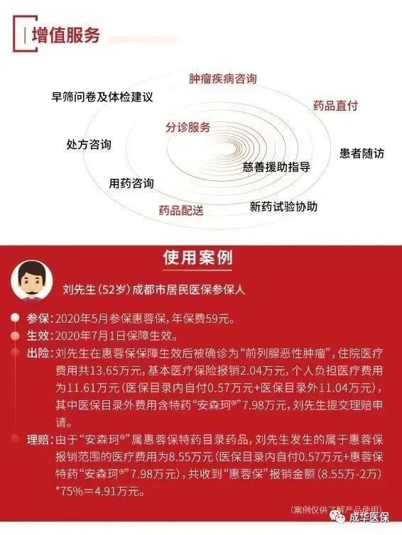 “惠蓉保”紧密衔接社会基本医疗保险,保障内容涵盖社会基本医疗保险范围内的医疗费用,覆盖住院费用、门诊特病费用,同时保障医保范围外的20种肿瘤及罕见病的高额自费药品费用,最高保障额度100万。在高额保障的基础上,“惠蓉保”为参保人提供肿瘤疾病咨询、分诊服务、药品直付和药品配送等10项贯穿诊前、诊中、诊后的全流程医疗健康管理服务。