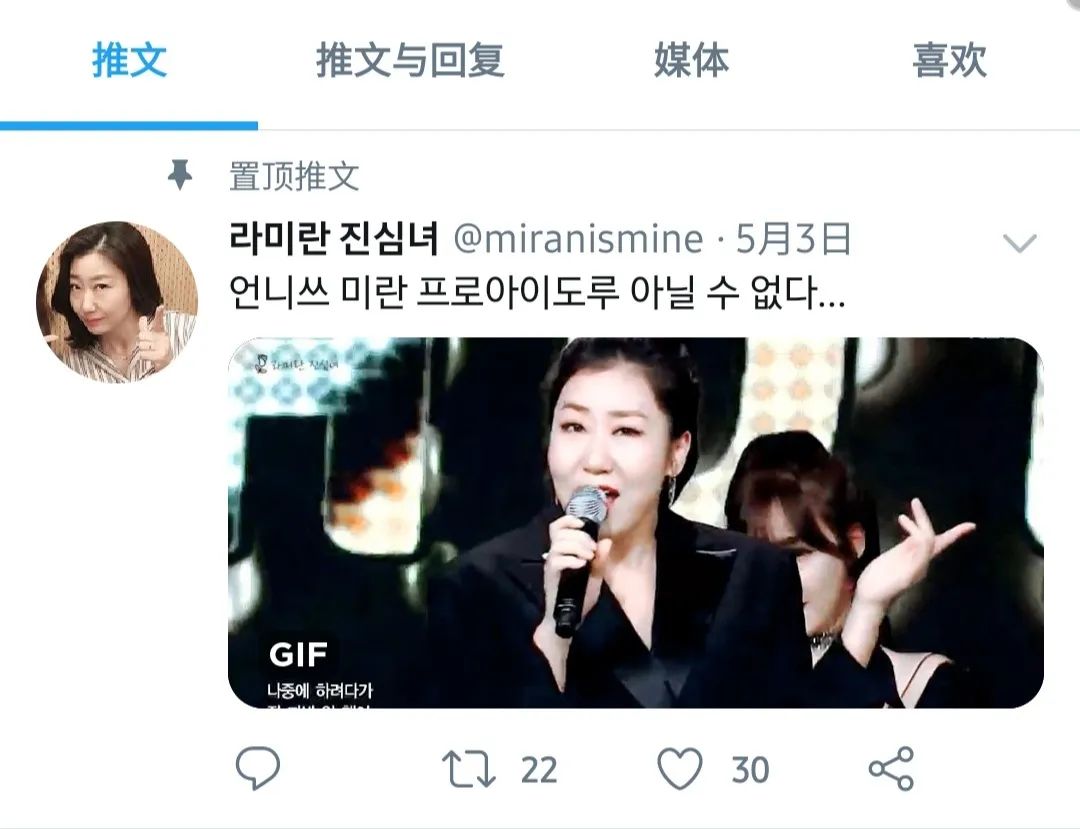 姐姐们的粉丝构成也是有趣的。除了本身是偶像的少女时代成员黄美英,在节目大火之后,以模特、演员身份活动的姐姐们也拥有了自己的“粉丝站”。以年龄最大的成员罗美兰为例,在推特上输入“라미란”(罗美兰),拥有最多关注者的账号是在2017年才注册的。置顶的推文是罗美兰在Unnies打歌舞台上的表演动图,配文:Unnies的美兰,不得不说是professional idol。