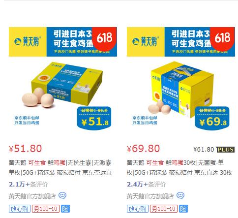 5月21日,记者登录多个电商网站发现,黄天鹅鸡蛋目前在秒杀促销。在京东商城黄天鹅旗舰店内,一款净重1千克的盒装鸡蛋售价51.8元。