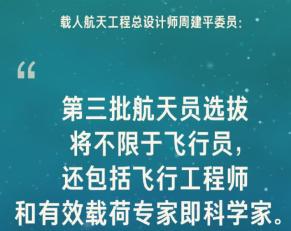 ▲载人航天工程总设计师周建平委员24日透露,第三批航天员选拔将不限于飞行员,还包括飞行工程师和有效载荷专家即科学家。周建平说,第三批航天员选拔是为了去空间站执行任务,将科学家送入太空。
