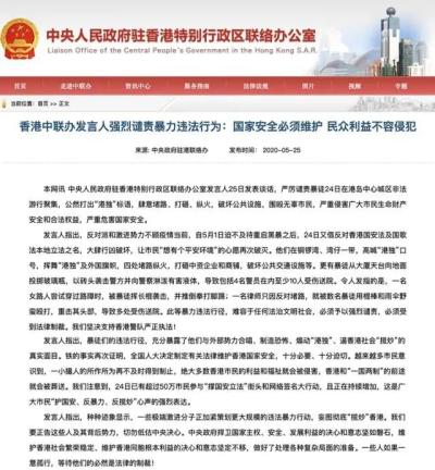 ▲香港中联办发言人25日发表谈话,严厉谴责暴徒24日在港岛中心城区非法游行聚集,公然打出“港独”标语,肆意堵路、打砸、纵火,破坏公共设施,围殴无辜市民,严重侵害广大市民生命财产安全和合法权益,严重危害国家安全。种种迹象显示,一些极端激进分子正加紧策划更大规模的违法暴力行动,妄图彻底“揽炒”香港。我们要正告这些人及其背后势力,切勿低估中央决心。中央政府捍卫国家主权、安全、发展利益的决心和意志坚如磐石,维护香港社会繁荣稳定、维护香港同胞根本利益的决心和意志坚定不移,做好了处理各种复杂局面的准备。一些人如果一意孤行,等待他们的必然是法律的制裁!