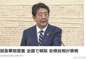 ▲日本首相安倍晋三5月25日傍晚在记者会上宣布,解除东京都、北海道、埼玉县、千叶县、神奈川县等5个都道县的紧急状态。至此,日本全国47个都道府县全部被解除紧急状态。