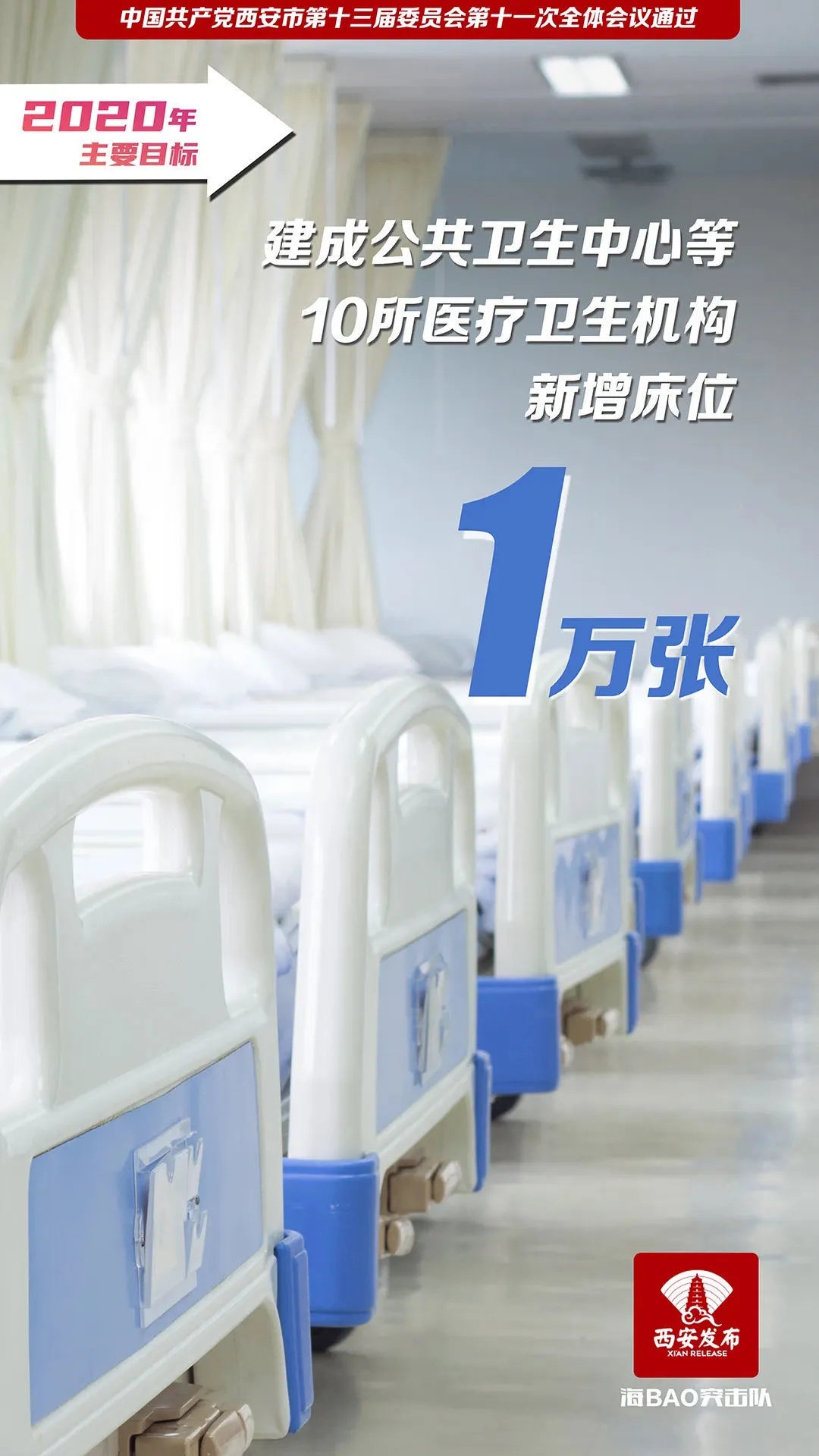 5月14日,中共西安市委十三届十一次全会举行,全会审议通过的《中共西安市委关于深入学习贯彻习近平总书记来陕考察重要讲话奋力谱写西安新时代追赶超越新篇章的决定》指出,要全面落实习近平总书记关于“加强民生保障和社会建设”的重大要求,不断增强人民群众获得感幸福感安全感,建设多层次社保体系,提升公共卫生服务能力。2020年,要加快建设国家区域医疗中心,建成公共卫生中心等10所医疗卫生机构、新增床位1万张。