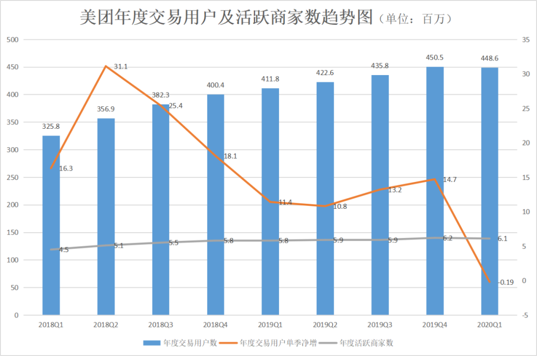 疫情期间,外卖业务遭受重击,季度交易用户规模立刻出现了下滑,Q1季度美团交易用户数4.486亿,同比有所增长,环比19Q4的4.505亿,却下滑了190万,这才是真正“要命”的一个数据。