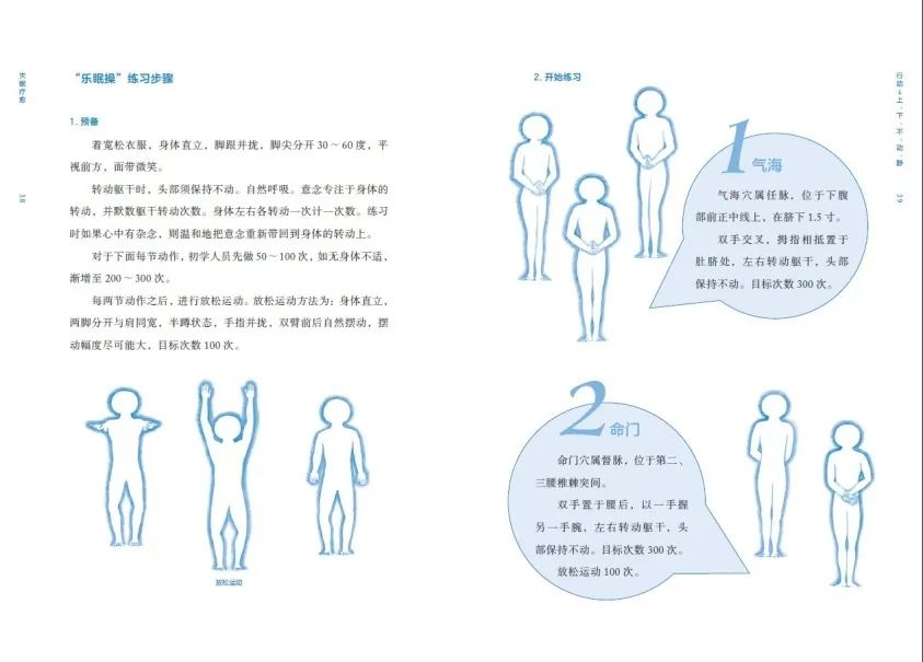 动:白天有氧运动1小时,推荐做“乐眠操”。乐眠操是在道家“筑基功”基础上经过改良形成的功法,包括“气海”、“命门”、“大椎”、“百会”、“神庭”、“膻中”等6节内容,主要通过转动人头部以下、腰部以上的躯干部分,锻炼“任脉”、“督脉”,减少心中杂念,起到放松和专注作用。书中配有详尽动作说明和图解,好读易学。