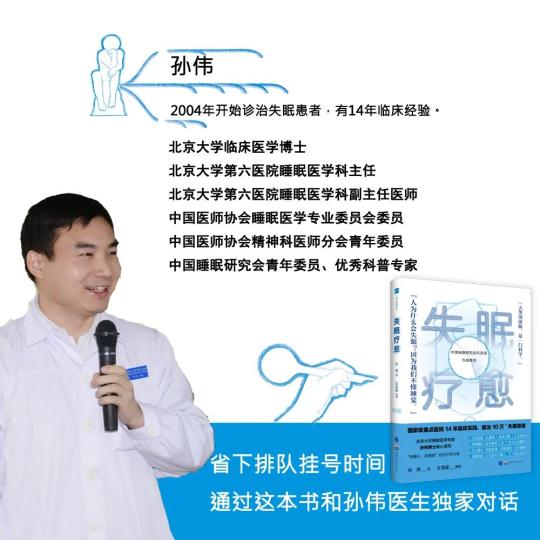 来自中国顶尖睡眠研究和诊疗机构——北京大学第六医院睡眠医学科的孙伟博士,是非常值得信赖的资深睡眠导师,拥有14年国家级重点医院临床实践经验,诊疗超过10万名失眠患者。并且,他也曾是失眠“当局者”,多年前求学时,孙伟博士有过两次深刻的失眠体验——一次发生在高考前一天深夜,另一次发生在研究生入学考试之前的深夜。最终失眠没有对他的成绩造成大的影响,却让他对失眠病患的恐惧和痛苦有了更真切的感知和体恤。