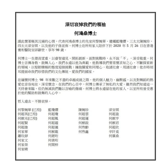 随后,何家四房共32人署名,由信德集团代表发文悼念,形容何鸿燊一生德高望重,取诸社会用诸社会,热爱祖国且珍惜文化传统,并指家人知道这天终会降临,但无法减轻难以言喻的伤痛。