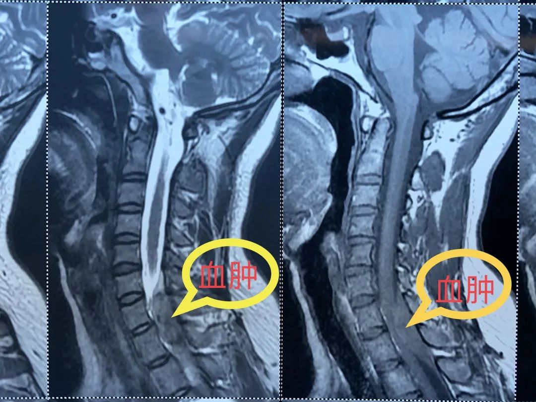 医生为患者申请紧急核磁检查,结果显示:颈髓有一个巨大的肿物压迫着。