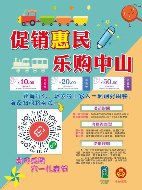 中山市民或来中山游玩的旅客朋友在指定的39个商圈或在本文中扫描二维码领取消费券,消费券的有效期为5天。在参加活动的商铺或场所使用微信结账,符合条件的消费,微信支付会自动使用消费券抵扣,还可以同时享受商圈或者商铺的促销优惠。消费者每个批次最多领取3张消费券(10元、20元、50元面值消费券),领完为止。