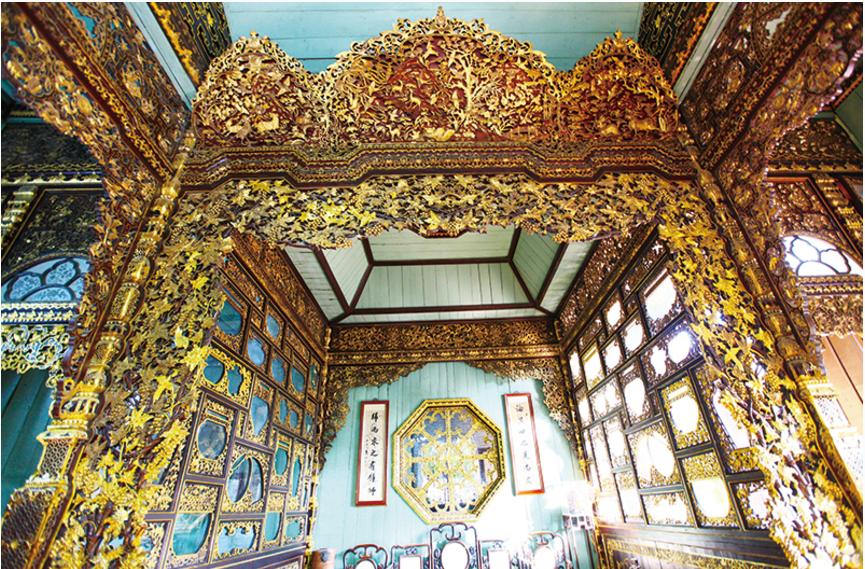 “金屋贮阿娇,楼阁起迢迢”。后来,晚清重臣戴鸿慈之女戴佩琼嫁入苏家,苏家大少苏伯雨将其安置在金楼之中伴读,故留下了金屋藏娇的传说。楼上壁门门櫉刻有清代名人刘墉、宋湘、王文治、张岳崧等人的书法作品,是广东省内保存较好的木雕艺术精品之一。图为碧江金楼内部图。杨芳 摄