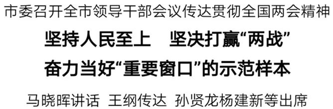 马晓晖指出,这次全国两会是在统筹推进疫情防控和经济社会发展的关键节点,在决胜全面建成小康社会和“十三五”规划收官的关键阶段,召开的一次十分重要的会议,凝聚了“六亿神州尽舜尧”的民心,传递了中国发展充满希望的信心,宣示了战胜任何艰难险阻的决心,彰显了让人民过上好日子的恒心。全市各级各部门和广大党员干部要以高度的政治自觉聚共识,深刻学习领会全国两会精神特别是习近平总书记的重要讲话精神,深刻学习领会全国两会各项报告的主要精神,迅速把思想和行动统一到全国两会的部署要求上来,在全市迅速掀起学习贯彻的热潮。