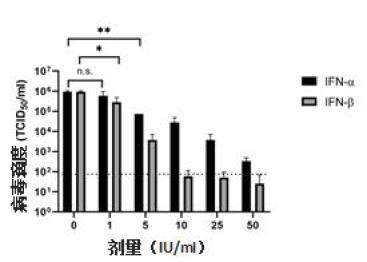 美国得克萨斯大学另一个研究团队探讨了干扰素抑制病毒的有效浓度范围。研究中采用不同浓度干扰素预处理Vero细胞,用新型冠状病毒感染细胞一定时间后测病毒滴度。结果发现,干扰素α和干扰素β的EC50(抑制半数病毒所需要的浓度)分别为1.35IU/ml和0.76 IU/ml,证实干扰素在体外能够有效抑制新型冠状病毒复制,且呈剂量依赖关系。