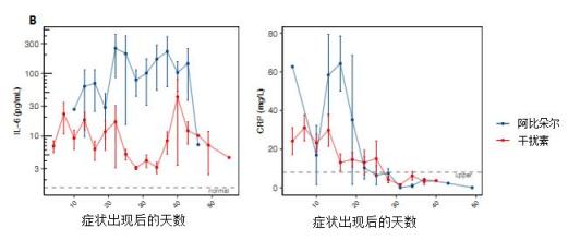 目前,已有多项干扰素治疗新冠肺炎的临床研究报道。其中,华中科技大学同济医学院研究人员进行的一项回顾性研究,分析了2020年1月~2月确诊的77名新冠肺炎住院患者的治疗效果。雾化吸入干扰素α治疗(500万IU/次,一天两次)与阿比朵尔(600mg/日)相比(结果见图4),干扰素治疗组可显著降低患者上呼吸道病毒载量,并缩短了血液中炎症反应指标(IL-6和CRP)复常的时间,且未见明显不良反应。