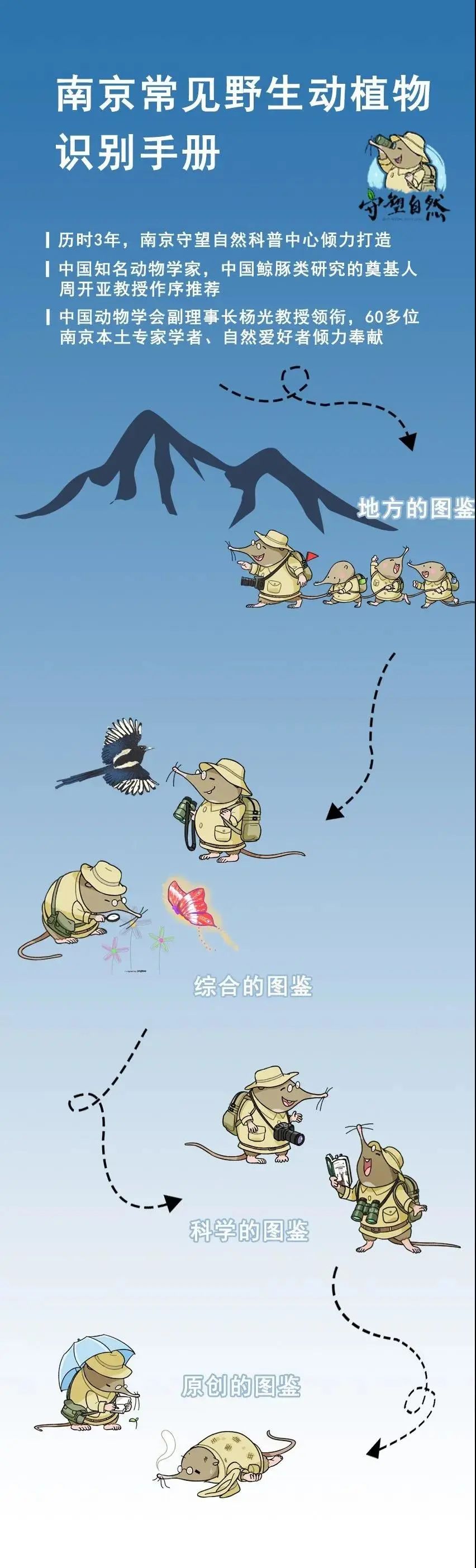 《南京常见野生动植物识别手册》的作者们,是一群热爱大自然的人,他们从最常见、最熟悉的事物开始观察自然,不仅仅是详实而易懂的图鉴类科普图书,更增加了作者与物种之间的互动和故事,图书的每一张照片都浸润着这些本土作者对南京这座城市深沉的关爱,对每一个物种的关心和对生态环境的关注。