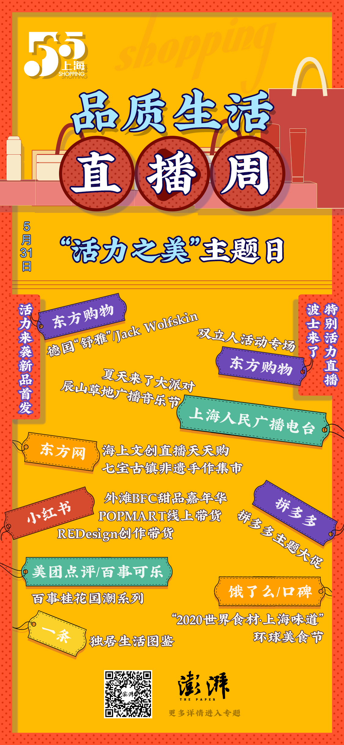 “品质生活直播周”将连续六天推出主题直播活动:5月31日“活力之美”聚焦青年消费;6月1日“亲子之美”聚焦儿童消费;6月2日“经典之美”聚焦老字号和国潮品牌;6月3日“时尚之美”聚焦女性消费;6月4日“居家之美”聚焦艺术家装和家居用品;6月5日“行走之美”聚焦文化场馆和文旅融合。