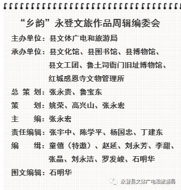 “乡韵”永登文旅作品周辑编委会现面向全县广大文学、文艺、书画等爱好者征集有关文学、文艺、书画、美术、歌曲、音视频等作品,所有征集作品一律经“乡韵”永登文旅作品周辑编委会严格审查后每周星期六在永登县文化广电和旅游局微信公众平台推出。