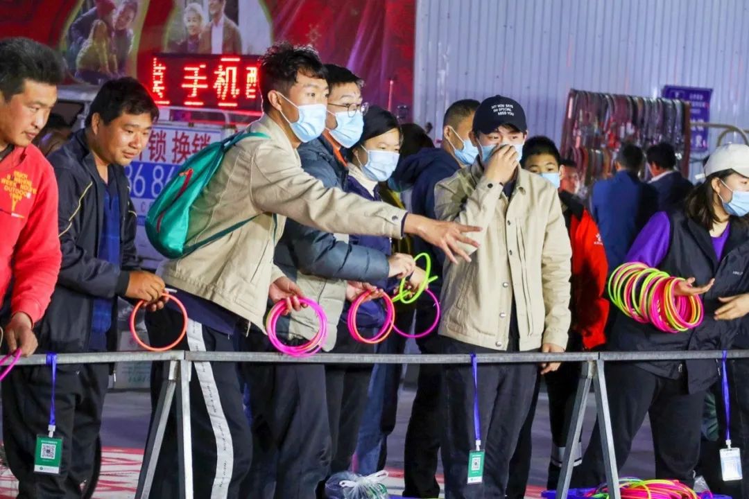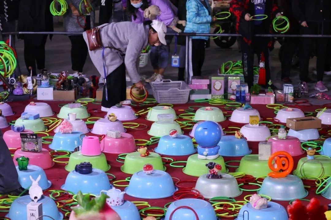 套圈的空地上,摆着一排排的锅碗瓢盆;玩具射击的布帘上,挂着红色的气球;气垫泳池的四周,孩子们正在父母陪伴下,用一根小杆子等待着小鱼儿愿者上钩……