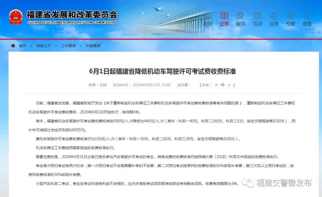 日前,福建省发改委、福建省财政厅发出《关于重新制定机动车牌证工本费和机动车驾驶许可考试费收费标准等有关问题的函 》,重新制定机动车牌证工本费和机动车驾驶许可考试费收费标,2020年6月1日开始执行,有效期3年。