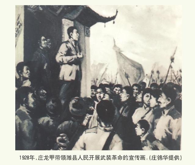 庄龙甲1903年出生于潍县庄家村,善于思考的他不受封建礼教束缚,对当时国内军阀混战、外敌入侵等现象愤愤不平。他在济南求学时,结识了王尽美,开始了短暂而辉煌的革命生涯。在省立一师,他担任第一任党支部书记。1925年,他在庄家村领导建立了潍县第一个党组织——中共潍县支部,在南屯村领导创建了山东省第一个农民协会。1926年,山东第一个县级党组织中共潍县地方执行委员会诞生,他担任书记。1928年,他领导建立了潍县赤卫队,这是潍坊大地上党领导下的第一支革命武装。