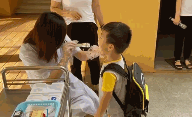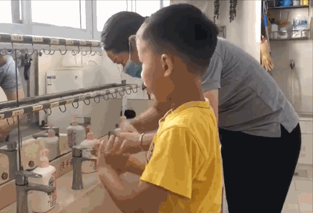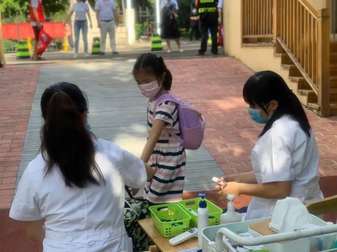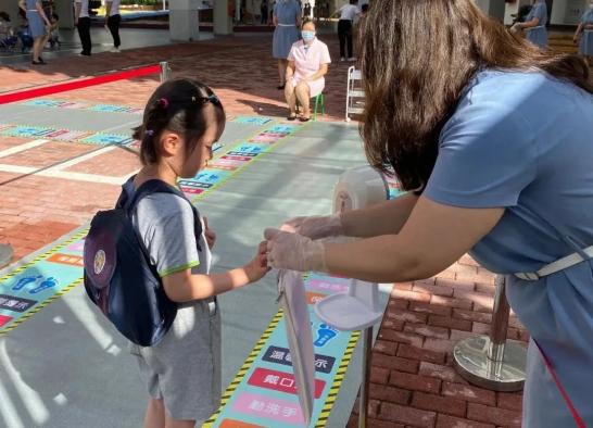 孩子进园后,会接受园医的检查,并且洗手消毒。