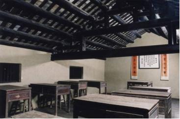 教室在一间小阁楼上,由木制梯子上去,木板的楼面,里面摆了七八张中国式高书桌。