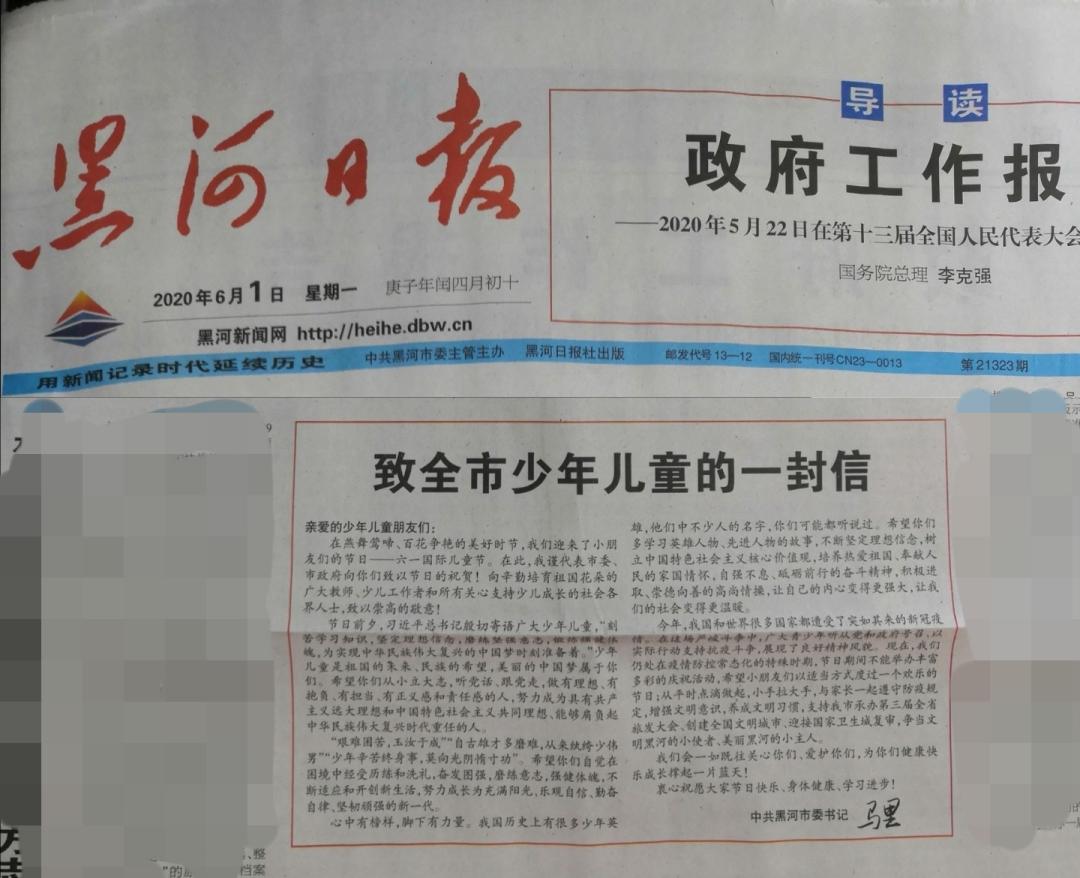 6月1日当天,市委书记马里《致全市少年儿童的一封信》在《黑河日报》头版刊发。